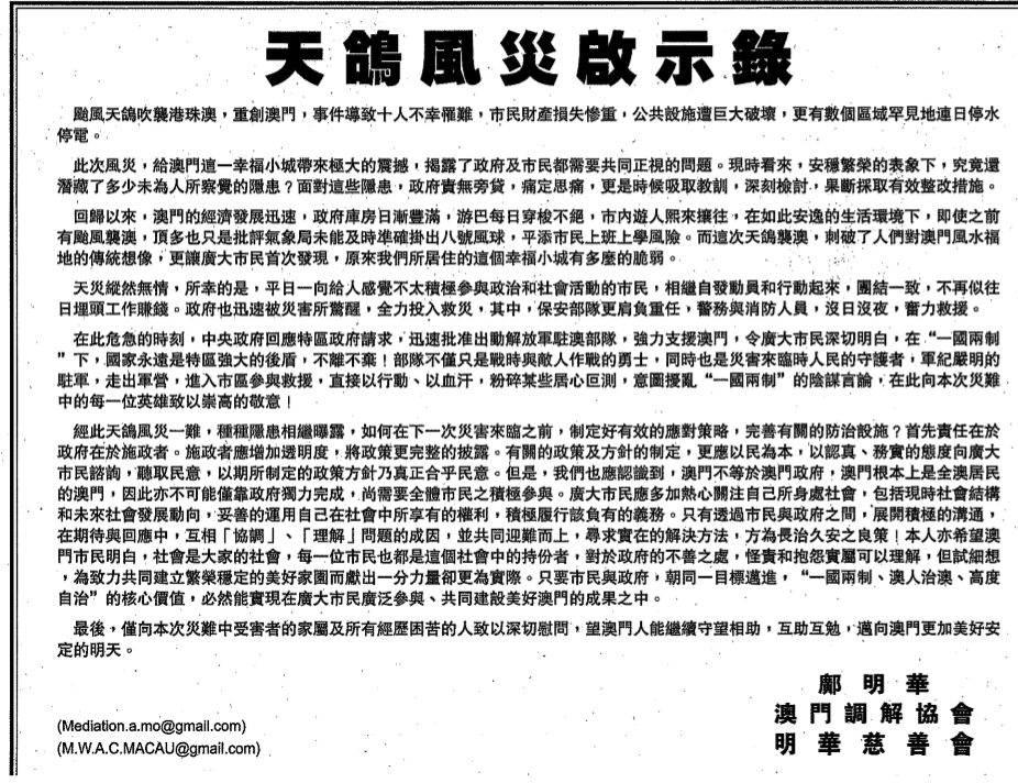 鄺明華澳門調解協會、明華慈善會發表天鴿風災啟示錄