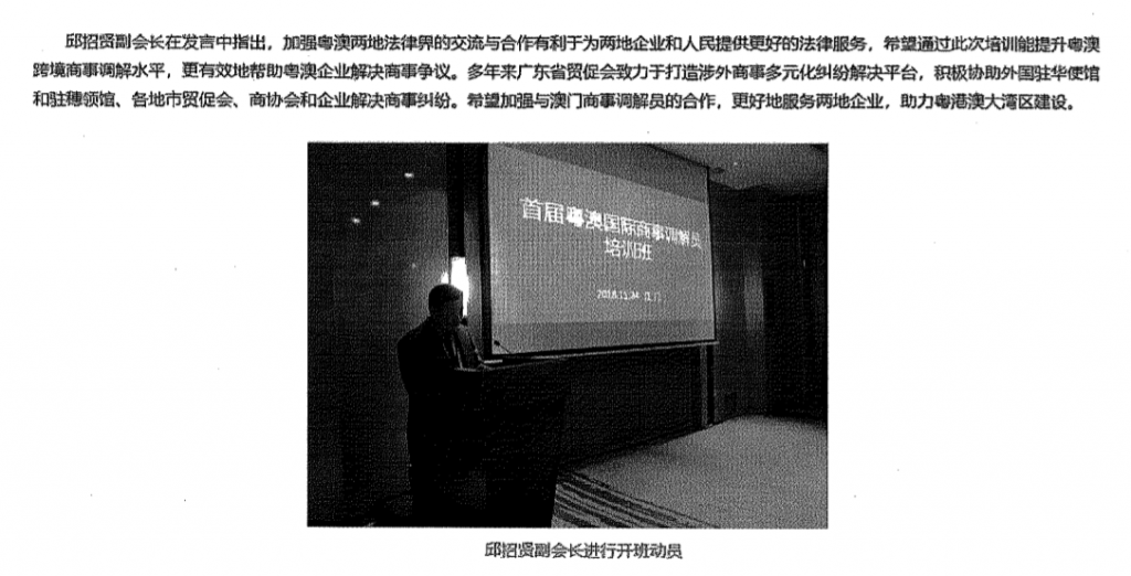 由中國貿促會商事法律服務中心,廣東省貿促會聯合澳門調解協會共同舉辦的“首屆粵澳國際商事調解員培訓班”,於2018年11月24日上午9時在江門舉辦;首屆培訓班分別邀請到“最高人民法院司法改革辦汪世榮副主任”、“中國貿促會調解中心王芳副處長”、“國家法官學院蔣惠岭副院長”、“意大利米蘭商會Stefano Pavletic專家調解員”作講師,為學員們講解“國家多元化糾紛解決機制改革現狀及對商事調解的支持”、“調解規則及調解員守則解析”、“商事調解的國內外現狀及展望”、“國際商事調解技能技巧及中意高解比較”。