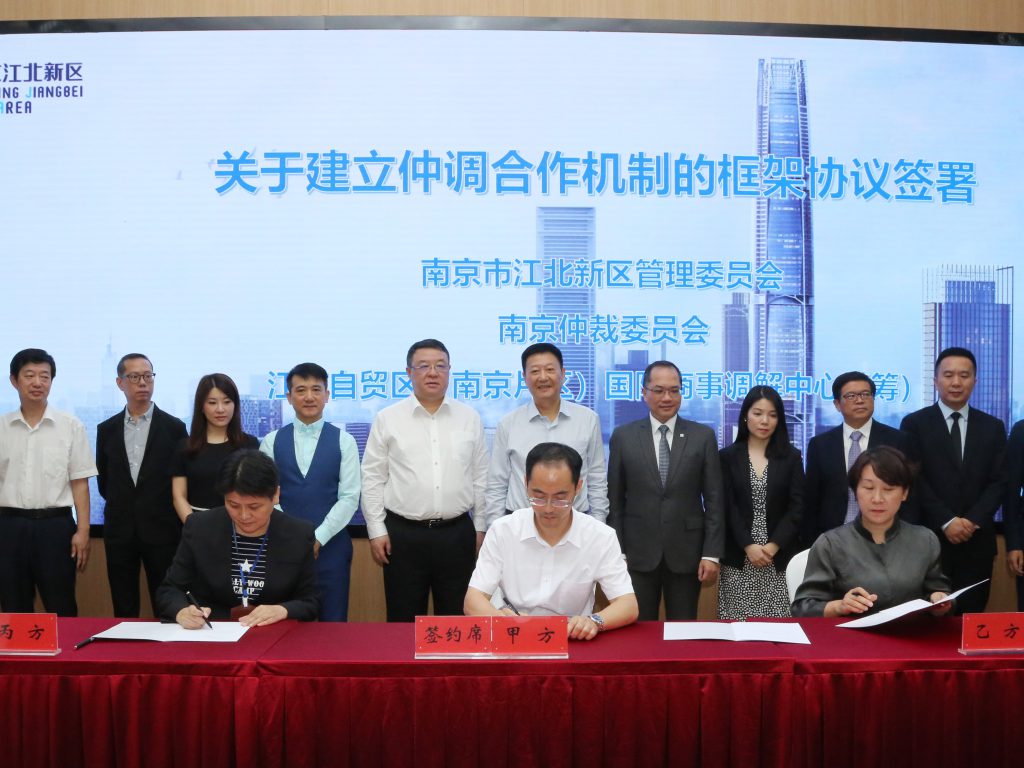在與會者的見證下,江蘇自貿區(南京片區)國際商事調解中心戰略合作協議、特邀調解合作意向備忘錄以及仲調合作機制框架協議正式簽約。中心由香港國際爭議解決及風險管理協會、北京市中銀律師事務所、南京民商調解和解中心等單位共同成立。未來,中心將為新區建設提供高質優效的綜合法律服務。在開拓自貿區國際商業貿易發展的基礎上,中心還將配合新區“兩城一中心”建設,把新區打造成中國國際貿易、國際法律及風險管理的樞紐,在全國范圍內率先開展和國際通行模式相符的最新創新管理和運營模式。